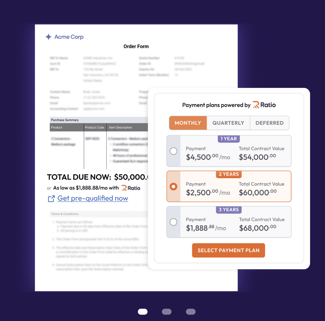 The standout advantage: The financing partner assumes the underwriting risk. This means while you enjoy the full contract value upfront, the partner manages and collects customer payments based on the chosen subscription terms.