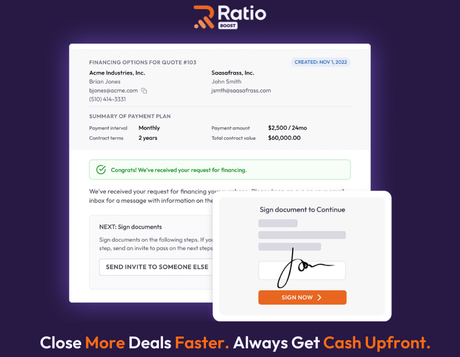 Even if a buyer pays over time as per their terms, Ratio Boost pays you up to 96% of the Annual Contract Value (ACV) on day one. You choose how to handle the financing fee(~4%)—absorb it, split it with the buyer, or pass it all to the buyer.