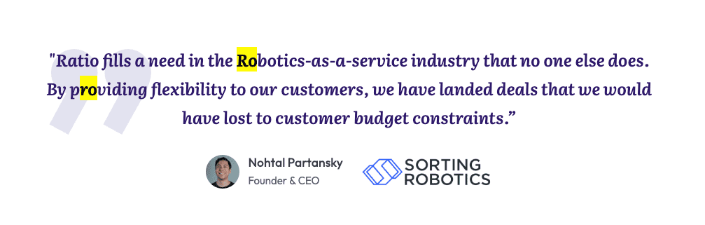 - Robotics-as-a-Service Facilitation: Robotics companies face a high demand for capital, and their customers increasingly seek the flexibility of subscription-based payments. To meet these needs, Ratio Boost assists these firms in effectively implementing the Robotics-as-a-Service model.