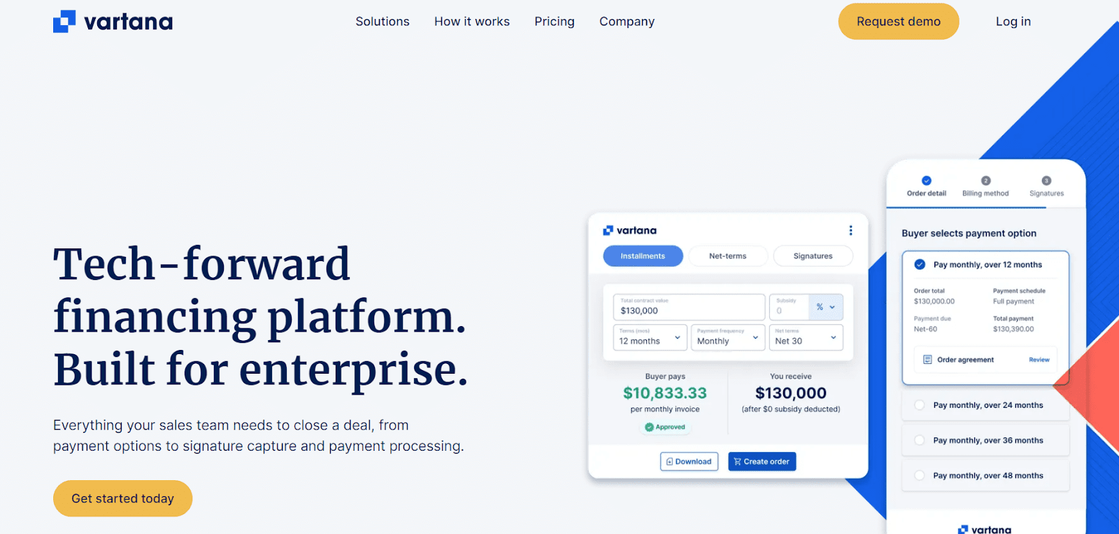 Vartana is a finance platform designed to accelerate enterprise sales. Equipped with diverse payment options for signature capture and payment processing—Vartana is a one-stop solution for closing more deals.