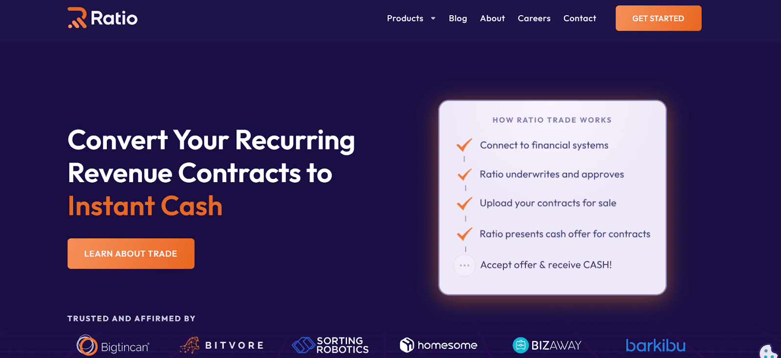 Besides offering an RBF solution called Ratio Boost, Ratio steps beyond the norm in RBF, pioneering a platform that turns your recurring revenue contracts into immediate cash—no strings of warrants or dilution attached with its solution called Ratio Trade.