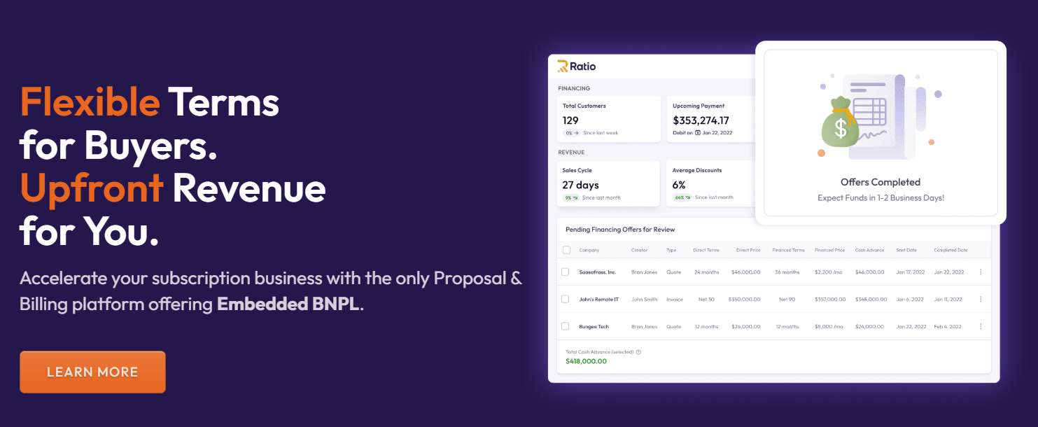No generic lending plug-in. Ratio’s pool is designed for recurring revenue, funding qualified deals upfront so you collect on Day 1. Meanwhile, your buyers pay flexibly over time.