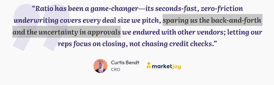 By embedding Ratio Boost into their proposal flow, MarketJoy lets buyers choose flexible payment terms (monthly, quarterly, deferred) right at the quote—and still get paid upfront. This eliminated procurement bottlenecks and cash delays without discounting or chasing invoices.