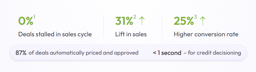 - Deal acceleration, not just funding: Sales reps can close in one call with embedded financing directly in quotes. No more waiting weeks for procurement or approvals.