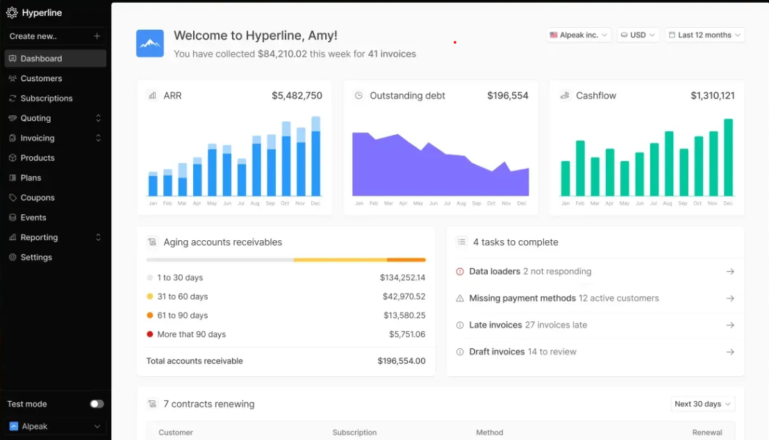 Hyperline is a modern revenue management platform that unifies quote-to-cash, billing, and usage-based pricing in one system. It supports every pricing model (subscriptions, usage, tiers, enterprise contracts), automates invoicing, collections, and revenue recognition.