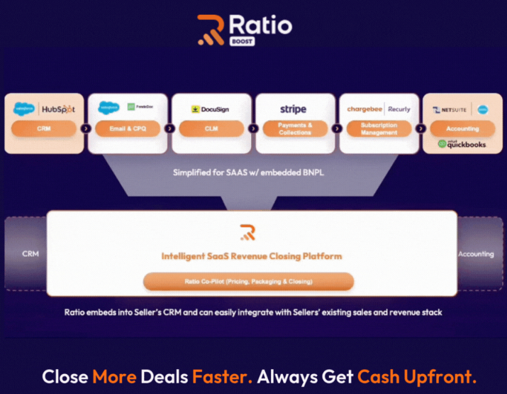 Ratio Boost builds on adding financing, AR automation, and subscription management — with seamless integrations into Salesforce, HubSpot, Stripe, NetSuite, QuickBooks, Chargebee, Xero, and more.